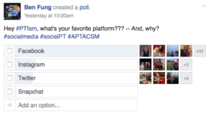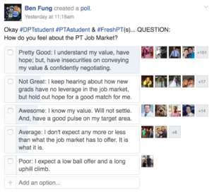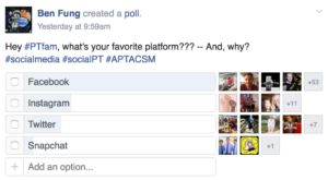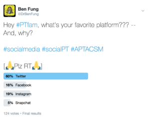 Okay, so here’s the deal. I asked on several platforms where our PT colleagues like to hangout on social media. Here are the results. Now of course, by platforms, there will be some native biases… but, you get the picture: