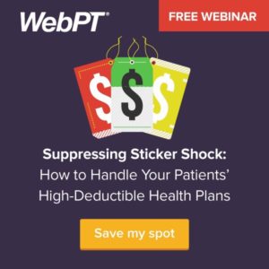 Have you had the deductible talk with a patient yet? Yea, chances are you have. It’s a difficult conversation to navigate. Would you like to learn how to tackle it head on and improve the persons understanding in such a way that it helps everyone? Have you had issues collecting payments from patients with high-deductibles? Obviously, there are many issues with high-deductible insurance plans. Check out this FREE webinar, Suppressing Sticker Shock by Heidi Jannenga, President of WebPT and Nancy Ham, CEO of WebPT! Heidi and Nancy address the aforementioned questions and help explain strategies to handle patients with high-deductible plans. You don’t want to miss it!